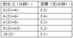 例3,國內(nèi)長途話費在時長不超過4分鐘的情況下,按0.07元/6秒收;超過4分鐘但不超過6分鐘,統(tǒng)一按0.06元/6秒收。怀^6分鐘但不超過8分鐘,統(tǒng)一按0.05元/6秒收。怀^8分鐘但不超過10分鐘,統(tǒng)一按0.04元/6秒收;超過10分鐘,統(tǒng)一按0.03元/6秒收取。