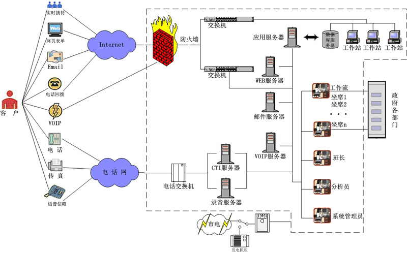 1.呼叫中心:提供傳統(tǒng)呼叫中心功能,實現(xiàn)電話網(wǎng)絡(luò)的呼入呼出、座席管理和數(shù)據(jù)庫維護等;