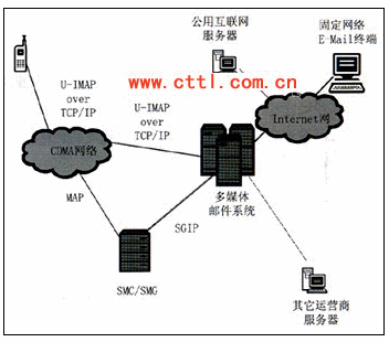 圖中的移動(dòng)郵件服務(wù)器(又稱U-IMAP server)負(fù)責(zé)消息的存儲(chǔ)、通知和通常處理。根據(jù)不同的模式,多媒體郵件系統(tǒng)可以是一個(gè)單一的邏輯單元,也可以分為MTA,IMAP4/POP3處理單元,U-IMAP處理單元,并可以和MSS合設(shè)。多媒體郵件服務(wù)器在收發(fā)多媒體彩E消息時(shí)能夠生成計(jì)費(fèi)數(shù)據(jù)。移動(dòng)郵件服務(wù)器同手機(jī)的通信協(xié)議采用U-