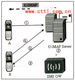 2)UIMAP Server把郵件存入目標(biāo)手機(jī)終端B的郵箱,并向短信中心發(fā)送新郵件到達(dá)的短信以通知用戶;