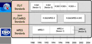 國際標(biāo)準(zhǔn)通常是由國際標(biāo)準(zhǔn)化組織ISO在國際電信聯(lián)盟 ITU的技術(shù)建議的基礎(chǔ)上制訂的。數(shù)字視頻編解碼標(biāo)準(zhǔn)也經(jīng)歷了多次變革,其演變進(jìn)程如圖所示: