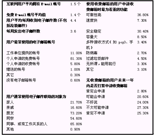 根據(jù)中國互聯(lián)網(wǎng)信息中心的調(diào)查顯示,中國現(xiàn)有9400萬互聯(lián)網(wǎng)用戶, 用戶最經(jīng)常使用的網(wǎng)絡服務和功能是電子郵箱:占85.6%。