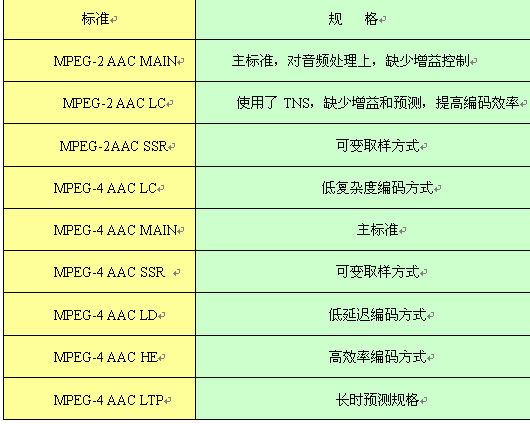 目前國際上對音頻處理技術(shù)上標準較多,在對下一代實時交互音頻處理上可以采用MPEG-1Layer2或AAC系列音頻,對選用標準的原則是,音頻頻響范圍要達到22KHz,這樣就幾乎可以覆蓋了人耳聽覺的全部范圍,甚至在高頻方面還有所超越,能夠使現(xiàn)場音頻得到真實自然的還原,并且在還原時可以采用雙聲道立體聲回放,使整個視頻通訊的聲音有更強的臨近感,達到CD級音質(zhì)。同時在對鏈路帶寬的適應(yīng)和編解碼效率上達到最佳。下表列出AAC的9種規(guī)格。