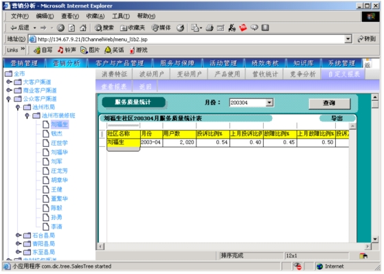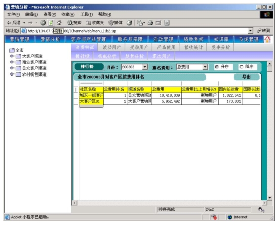 本系統(tǒng)是以市場(chǎng)為導(dǎo)向、客戶為中心、效益為目標(biāo)的電信營(yíng)銷和服務(wù)的支撐系統(tǒng),為企業(yè)經(jīng)營(yíng)服務(wù)和營(yíng)銷戰(zhàn)略提供有力的支撐,通過對(duì)業(yè)務(wù)收入、業(yè)務(wù)發(fā)展以及市場(chǎng)競(jìng)爭(zhēng)的深入分析,從而達(dá)到留住老客戶、發(fā)現(xiàn)新客戶,了解競(jìng)爭(zhēng)對(duì)手動(dòng)態(tài),及時(shí)掌握市場(chǎng)變化趨勢(shì)的目的。