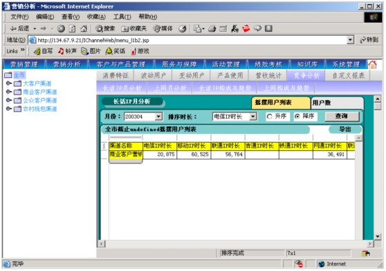 分析各運(yùn)營(yíng)商在經(jīng)營(yíng)業(yè)務(wù)類中市場(chǎng)占有率、排名情況。例如IP、上網(wǎng)、長(zhǎng)途話務(wù)量市場(chǎng)占有率情況。