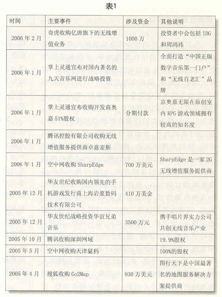 從2003年開始,國內(nèi)就顯現(xiàn)出并購增值服務(wù)運營企業(yè)的苗頭。2004年以來,隨著整治增值服務(wù)運營企業(yè)的力度不斷加大,并購漸成風(fēng)潮(見表1)。2004年2月,新浪收購深圳網(wǎng)興科技公司;2004年5月,搜狐收購手機WAP服務(wù)提供商北京吉菲爾公司。2005年,在“超級女生”節(jié)目大獲成功后,掌上靈通宣布將對國內(nèi)著名的九天音樂網(wǎng)進行戰(zhàn)略投資,全面打造“中國正版數(shù)字音樂第一門戶”和“無線百老匯”品牌。各大移動增值業(yè)務(wù)服務(wù)商通過并購競爭對手,門戶網(wǎng)站可以在移動增值服務(wù)領(lǐng)域?qū)で笮碌耐黄,獲得可觀的利益,增強自身的競爭力。伴隨著3G商用的日益臨近和市場競爭的不斷加劇,主流SP(服務(wù)提供商)進一步加快了資本購并和業(yè)務(wù)整合的步伐,整個SP行業(yè)將加速洗牌。經(jīng)過市場整合,主流SP將不斷做大做強,而相當(dāng)多的缺乏市場競爭力的SP將被淘汰出局。