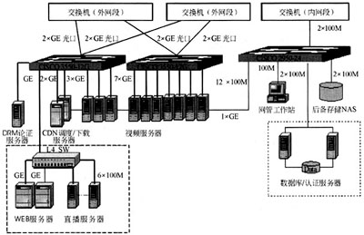 核心包括以下子系統(tǒng):WEB服務(wù)子系統(tǒng)、認(rèn)證服務(wù)器、CDN調(diào)度/下載服務(wù)器、流媒體播出服務(wù)子系統(tǒng)、DRM認(rèn)證服務(wù)子系統(tǒng)、數(shù)據(jù)庫服務(wù)子系統(tǒng)、后備存儲(chǔ)NAS系統(tǒng)、內(nèi)部管理服務(wù)子系統(tǒng)等。