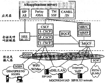 一般IMS分為三層,應(yīng)用層支持各類應(yīng)用服務(wù)器,負責(zé)為用戶提供增值業(yè)務(wù)和第三方業(yè)務(wù)。會話及呼叫控制層負責(zé)管理呼叫或會話設(shè)置,其中呼叫會話控制模塊CSCF完成呼叫網(wǎng)關(guān)功能、呼叫業(yè)務(wù)觸發(fā)功能和路由選擇功能,將SIP信令消息正確地轉(zhuǎn)發(fā)到應(yīng)用服務(wù)器。歸屬用戶服務(wù)器HSS用于維護每個終端用戶獨有的業(yè)務(wù)屬性,包括IP地址、漫游信息、好友列表、呼叫業(yè)務(wù)定制信息及語音郵件設(shè)置等。HSS是全網(wǎng)可用資源。媒體資源功能MRF包括MRFP和MRFC,負責(zé)提供及控制媒體流資源,如播放通知音、媒體流的混合、編解碼等。媒體網(wǎng)關(guān)控制MGCF負責(zé)PSTN承載與IP流之間的連接,根據(jù)被叫號碼和來話情況選擇CSCF,并完成PSTN與IMS之間的呼叫控制協(xié)議轉(zhuǎn)換,如將從CSCF接收到的SIP消息轉(zhuǎn)換為MEGACO或ISUP消息,并通過IP發(fā)送到信令網(wǎng)關(guān)SGW。出口網(wǎng)關(guān)控制功能BGCF主要實現(xiàn)呼叫路由功能,為呼叫選擇適當(dāng)?shù)腜STN接口點,若發(fā)現(xiàn)該接口點與自己在同一網(wǎng)絡(luò),則選擇本網(wǎng)絡(luò)的MGCF與PSTN交互,若發(fā)現(xiàn)接口點在另一網(wǎng)絡(luò)時,BGCF將會話信令轉(zhuǎn)發(fā)給另一網(wǎng)絡(luò)相應(yīng)的BGCF。一個IMS可以包含一個或多個CSCF、HSS、MGCF等功能模塊。傳送及接入層承載各種類型之間的轉(zhuǎn)換,完成與傳統(tǒng)PSTN/PLMN間的互通等功能,包括各類有線接入、無線接入、互聯(lián)互通網(wǎng)關(guān)等設(shè)備。