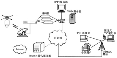 。。WiMAX網(wǎng)絡(luò)支持豐富多彩的業(yè)務(wù)模式。不同速率的數(shù)據(jù)業(yè)務(wù)是網(wǎng)絡(luò)的主要承載目標。WiMAX支持不同的QoS級別,因此網(wǎng)絡(luò)覆蓋范圍與業(yè)務(wù)類型緊密相關(guān)。在IPTV的接入方面,由于IPTV需要高級別的QoS保證以及高速的數(shù)據(jù)傳輸速率,所以根據(jù)小區(qū)內(nèi)用戶的數(shù)量以及需求,合理設(shè)置WiMAX網(wǎng)絡(luò)。用戶接入IPTV網(wǎng)絡(luò)的時候。不需要再次進行布線,只需加裝WiMAX接收設(shè)備和IP機頂盒即可,因此用戶可以方便、快捷地使用IPTV業(yè)務(wù)。WiMAX實現(xiàn)IPTV的接入如圖1所示。