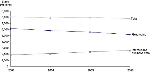 但問(wèn)題是,在發(fā)達(dá)國(guó)家,用戶寬帶接入市場(chǎng)已經(jīng)接近飽和。正因?yàn)槭沁@樣一種情況,所以用戶數(shù)量也就很難再有增加。ARPU值在極大的競(jìng)爭(zhēng)壓力下也很難有很大的突破。一切都靜止不動(dòng),固話收入持續(xù)下降,所以圖中的“'Internet and business data”部分的收益增長(zhǎng)幅度也在逐漸縮小。從圖中的業(yè)務(wù)走勢(shì)線可以看出,總收益也從開(kāi)始的8百萬(wàn)歐元下降到了6百萬(wàn)歐元。