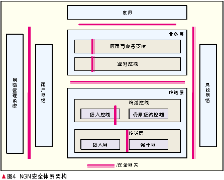 為了給網(wǎng)絡(luò)運營商、業(yè)務(wù)提供商和用戶提供一個安全可信的網(wǎng)絡(luò)環(huán)境,防止各種攻擊,NGN需要避免出現(xiàn)非授權(quán)用戶訪問網(wǎng)絡(luò)設(shè)備上的資源、業(yè)務(wù)和用戶數(shù)據(jù)的情況,需要限制網(wǎng)絡(luò)拓?fù)浣Y(jié)構(gòu)的可見范圍,需要保證網(wǎng)絡(luò)上傳送的控制信息、管理信息和用戶信息的私密性和完整性,需要監(jiān)督網(wǎng)絡(luò)流量并對異常流量進行管理和上報。