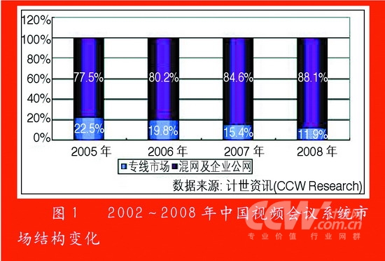 從市場(chǎng)結(jié)構(gòu)上看,混網(wǎng)及Internet軟件視頻會(huì)議系統(tǒng)市場(chǎng)已經(jīng)形成了對(duì)專(zhuān)線市場(chǎng)的主導(dǎo)地位的挑戰(zhàn),僅2004年,專(zhuān)線市場(chǎng)就比2003年下降了19.5個(gè)百分點(diǎn),到2005年混網(wǎng)及企業(yè)公網(wǎng)市場(chǎng)份額達(dá)到77.5%,而在2006年,混網(wǎng)及Internet視頻會(huì)議系統(tǒng)已經(jīng)達(dá)到80.2%的市場(chǎng)占有率,基本占據(jù)了市場(chǎng)的主導(dǎo)地位。