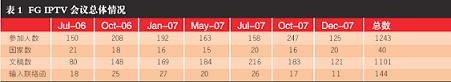 FGIPTV在一年半的時間里共召開了7次會議,收到了1101篇文稿,參加者包括來自40個國家的1243名專家(見表1),其中既包括傳統(tǒng)電信網(wǎng)的專家,也包括來自廣播電視行業(yè)、IT業(yè)的專家,通過這7次會議、提交的文稿以及專家們的貢獻(xiàn),一方面產(chǎn)生了IPTV的定義,另一方面也形成了21個工作文檔,并根據(jù)這些文檔的內(nèi)容確定了負(fù)責(zé)此文檔的相應(yīng)研究組和課題(即Q/SG),詳見表2。