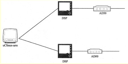 下一代媒體網關系統(tǒng)主要由媒體網關、媒體網關控制器和信令網關組成,實現了功能上的分解。為了適應不同的網絡,本文主要介紹了媒體網關的實現方法,其中媒體網關的主要作用是實現模擬信號由電路交換轉換成數字信號PCM編碼,并進行G.711或者G.723等格式編碼。為了實現媒體網關,整個系統(tǒng)由3部分組成,包括基于ARM架構的嵌入式系統(tǒng)(uClinux)、語音信號轉換芯片(TLC320AD50)和定點數字信號處理器(TMS320VC54xx),如圖3所示。