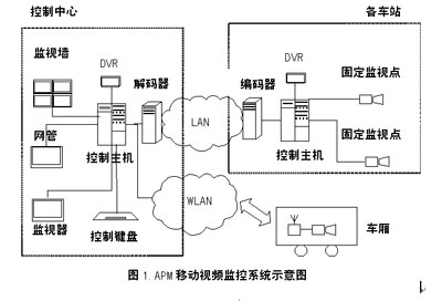 移動(dòng)視頻監(jiān)視系統(tǒng)主要包括前端設(shè)備、后端設(shè)備和傳輸設(shè)備組成。前端設(shè)備主要指圖像攝取設(shè)備(如各種類(lèi)型的攝像機(jī)),后端設(shè)備主要指圖像顯示、圖像錄制、系統(tǒng)控制等設(shè)備,前后端需要通過(guò)傳輸系統(tǒng)連接。為了支持系統(tǒng)的移動(dòng)功能,傳輸環(huán)節(jié)中至少有一部分是無(wú)線(xiàn)傳輸系統(tǒng)。APM移動(dòng)視頻監(jiān)控系統(tǒng)的組成如圖1所示。