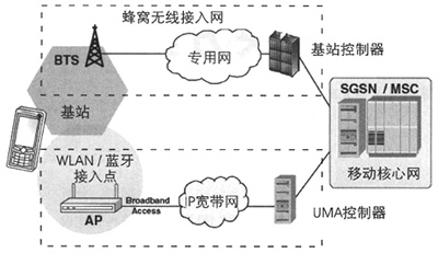 通過非授權(quán)網(wǎng)絡(luò)(藍(lán)牙或WiFi),UMA技術(shù)可從傳統(tǒng)蜂窩網(wǎng)絡(luò)或本地GSM和GPRS移動(dòng)服務(wù)的手機(jī)自動(dòng)切換到UMA接入點(diǎn),使手機(jī)無中斷地檢測(cè)到速度最快、最經(jīng)濟(jì)的網(wǎng)絡(luò),從而使手機(jī)用戶可以最靈活的方式獲得先進(jìn)的手機(jī)服務(wù)。手機(jī)離開UMA接入點(diǎn)的覆蓋范圍后,則無縫切換回蜂窩網(wǎng)絡(luò)。圖1為 UMA網(wǎng)絡(luò)拓?fù)浣Y(jié)構(gòu):