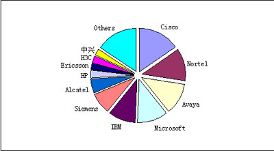 各大通信與IT廠商都在厲兵秣馬,充分挖掘企業(yè)的自身優(yōu)勢,準(zhǔn)備在潛力巨大的統(tǒng)一通信市場中取得良好戰(zhàn)績。賽迪顧問數(shù)據(jù)顯示,2008年上半年,中國統(tǒng)一通信市場中,Cisco公司以15.3%的市場份額繼續(xù)保持領(lǐng)頭樣的位置,在通信設(shè)備領(lǐng)域,Nortel和Avaya分別以12.1%和11.7%的市場份額緊隨其后。值得一提的是Microsoft和IBM以其在全球獨一無二的終端用戶,迅速占領(lǐng)統(tǒng)一通信軟件市場,無論是市場份額還是整體競爭力都成績不俗,且增長勢頭強(qiáng)勁。各大廠商短時間的涌入,使得統(tǒng)一通信市場出現(xiàn)了前所未有的群雄逐鹿的局面,競爭異常激烈。
