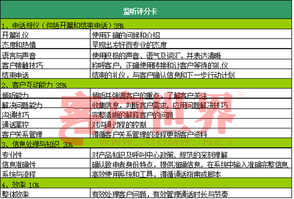 b.一個不可忽視的工作是對表中的各項進行嚴格定義,然后訓(xùn)導(dǎo)師與主管、培訓(xùn)、質(zhì)檢師根據(jù)共同的錄音資料反復(fù)“核對筆記”,取得共識,并將樣本打分結(jié)果發(fā)給座席代表溫習(xí)。
