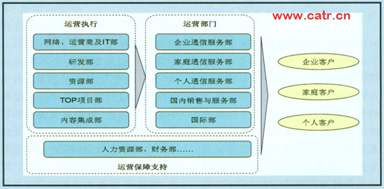 新型的融合產(chǎn)品和服務(wù)突破了原來的技術(shù)界限,如果還延續(xù)原有的按技術(shù)劃分的部門管理結(jié)構(gòu),必將產(chǎn)生過多的分支部門,造成企業(yè)結(jié)構(gòu)龐雜、效率低下,對新的綜合服務(wù)的市場需求缺乏感受力,新服務(wù)無法及時推向市場的問題。因此,重新進行部門劃分,實現(xiàn)內(nèi)部的協(xié)調(diào)配合是十分必要的。而業(yè)務(wù)提供的融合性、多元化及客戶的統(tǒng)一服務(wù)需求,使這種組織結(jié)構(gòu)的重新構(gòu)建最終將以客戶為中心進行構(gòu)建:在前端以客戶為中心劃分運營部門,實現(xiàn)對客戶的直接服務(wù),在后端,以業(yè)務(wù)、運維等職責(zé)為中心部署組織結(jié)構(gòu),形成對運營執(zhí)行的支撐。