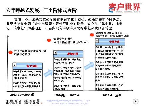 三個(gè)階段可以分為集中初始的02年10月到04年,規(guī)模運(yùn)營是04年底到07年的4月,那么07年4月至今已經(jīng)是專線專席運(yùn)營。我們的重點(diǎn)是在規(guī)模運(yùn)營和專線專席上有所突破,規(guī)模運(yùn)營主要是結(jié)合品牌策略,率先推出的是品牌客戶分層服務(wù);雙中心網(wǎng)絡(luò)呼叫中心解決方案應(yīng)用,實(shí)現(xiàn)互聯(lián)網(wǎng)思維模式及邏輯管理集中,物理結(jié)構(gòu)分散的多中心網(wǎng)絡(luò)呼叫中心;追求客戶滿意,運(yùn)營效率和效益的統(tǒng)一。07年開始,我們重點(diǎn)實(shí)現(xiàn)客服系統(tǒng)與業(yè)務(wù)BOSS系統(tǒng)的全面融合,實(shí)現(xiàn)客戶服務(wù)應(yīng)用的統(tǒng)一門戶。也就是說,無論是我們的電話服務(wù)、營業(yè)廳的服務(wù),還是客戶經(jīng)理的上門服務(wù),都應(yīng)用于客戶服務(wù)的統(tǒng)一門戶,實(shí)現(xiàn)著CRM的客戶關(guān)系管理。對于電話服務(wù)來講,我們以標(biāo)準(zhǔn)化、專業(yè)化的熱線服務(wù)運(yùn)營模式,提升專家級的精細(xì)化服務(wù)和大眾客戶的標(biāo)準(zhǔn)化服務(wù),使得管理和培訓(xùn)更聚焦,客戶代表更為輕松,同時(shí)也提高了員工滿意度,實(shí)現(xiàn)了追求客戶愉悅體驗(yàn)、員工滿意和為企業(yè)創(chuàng)造價(jià)值。