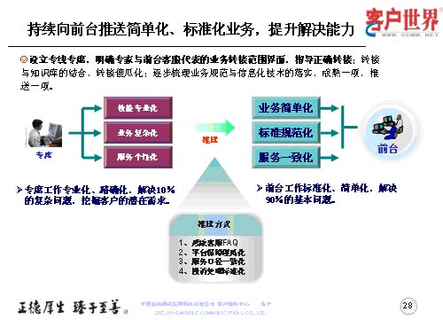 設(shè)立專線專席,并不是指專線越專越多,而是持續(xù)地向前臺推送簡單化、標(biāo)準(zhǔn)化的業(yè)務(wù),提升前臺一線的解決能力,所以我們重點(diǎn)以專線的技能專業(yè)化、業(yè)務(wù)復(fù)雜化、服務(wù)個(gè)性化,然后把簡單的形成規(guī)范標(biāo)準(zhǔn)的業(yè)務(wù)向前臺推送,保障專席的工作是專業(yè)化、精確化地解決10%的復(fù)雜問題,從而更多地去挖掘客戶的需求。而前臺客服的工作是用標(biāo)準(zhǔn)化、簡單化地解決90%的基本問題。