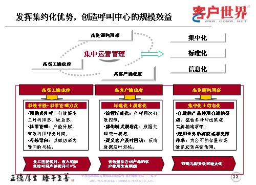 作為集中管理來講,突出“三高”,運(yùn)用好“三高”體現(xiàn)的是如何進(jìn)行集中化、標(biāo)準(zhǔn)化和信息化。我們從高員工滿意度,高客戶滿意度和高資源利用率入手,高員工滿意度主要是應(yīng)用平臺和科學(xué)的管理方法,使得員工的技能持續(xù)提升,員工的自身收入也按單位時(shí)間而增長;高客戶滿意度是用標(biāo)準(zhǔn)化和規(guī)范化來進(jìn)一步優(yōu)化流程,改進(jìn)操作,對于目標(biāo)客戶及時(shí)回訪,有效地延長公司產(chǎn)品的客戶使用生命周期,以創(chuàng)造公司的最大利益;作為集中化的呼叫中心,系統(tǒng)已經(jīng)投入了較大的座席規(guī)模,高資源利用率是如何把這些座席和系統(tǒng)的規(guī)模應(yīng)用得更好,使得我們的產(chǎn)品能夠進(jìn)一步地推向市場,被客戶所接受,所以我們采取了更多的整合呼出渠道,精確營銷,尤其對公司的存量客戶進(jìn)行持續(xù)維系的關(guān)鍵時(shí)刻,達(dá)到營銷與服務(wù)效率的最大化。