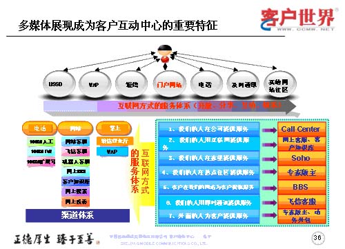 中國移動(dòng)集團(tuán)的呼叫中心大會已經(jīng)提出了多媒體呼叫中心模型,對于多媒體展現(xiàn)是成為客戶互動(dòng)中心的重要特征,是基于更多的觸點(diǎn),也就是說基于更多的多媒體觸點(diǎn),以互聯(lián)網(wǎng)的方式來建立服務(wù)體系的開放、分享、互動(dòng)和娛樂。