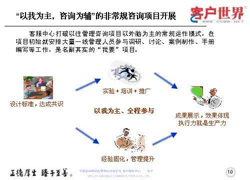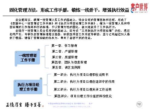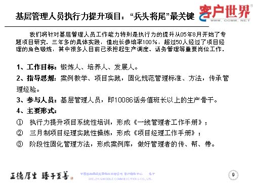 大家知道基層管理人員其實(shí)是兵頭將尾的最關(guān)鍵,我們將對基層管理人員的工作能力,特別是執(zhí)行力的提升是從05年8月份就開始了專項(xiàng)研究,三年多的具體實(shí)踐,值班長的培訓(xùn)率達(dá)到100%,超過50人經(jīng)過了項(xiàng)目經(jīng)理的角色鍛煉,目前很多擔(dān)任過項(xiàng)目經(jīng)理的已經(jīng)承擔(dān)了生產(chǎn)調(diào)度、話務(wù)管理等重要的管理崗位。在這個(gè)項(xiàng)目當(dāng)中,我們從四個(gè)方面入手,工作目標(biāo)是鍛煉人、培養(yǎng)人、發(fā)展人。指導(dǎo)思想是案例教育、項(xiàng)目實(shí)踐,固化規(guī)范管理標(biāo)準(zhǔn)、方法,傳承管理經(jīng)驗(yàn)。參與人員就是基層管理人員,話務(wù)值班長以上的生產(chǎn)骨干。我們主要運(yùn)用的形式是執(zhí)行力提升項(xiàng)目系統(tǒng)培訓(xùn),形成了《一線管理者工作手冊》。三月制項(xiàng)目經(jīng)理的實(shí)踐操練,通過競聘的方式產(chǎn)生,形成了《項(xiàng)目經(jīng)理工作手冊》。階段性的固化-優(yōu)化-再固化的管理方法,形成案例庫,做好管理者的傳幫帶。