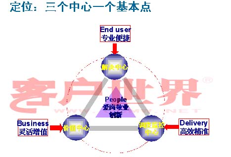 基于這樣的方向之后,我們?cè)谶@兩年就會(huì)把客戶聯(lián)絡(luò)中心凸顯在企業(yè)中價(jià)值的時(shí)候,做了一個(gè)重新的定位,這個(gè)定位其實(shí)就是說,這是一個(gè)金三角的狀態(tài),第一點(diǎn)因?yàn)槲覀円獙?duì)客戶凸顯的是專業(yè)、便捷,所以我們會(huì)給它叫做一個(gè)問題解決中心,在問題解決中心當(dāng)中我們定位得非常清楚,第一專業(yè),第二便捷。另外一點(diǎn),我們會(huì)利用現(xiàn)在客戶聯(lián)絡(luò)中心的資源,包括大家做呼叫中心知道它有業(yè)務(wù)的高低峰,這是一個(gè)方面。另外你是攥著大把客戶信息在里面,其實(shí)如何去挖掘這些客戶信息,去產(chǎn)生價(jià)值這是非常非常重要,所以我們會(huì)在這個(gè)角度上去做,怎么把它變成一個(gè)靈活增值的價(jià)值中心在里面。