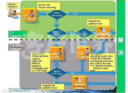 很多時(shí)候經(jīng)過知識(shí)庫的判斷,最后說這個(gè)問題是要在線去解決,也就是說我們要派到維修去的。另外一個(gè)挑戰(zhàn)性的問題就會(huì)出來,如果你派錯(cuò)一張單子,給一個(gè)公司的代價(jià)是非常非常大的。因?yàn)榕沙鲆粡垎巫樱谖疫@兒我要去給我的服務(wù)人員去結(jié)費(fèi)的,那么回過頭來我還要再重新派,我又再去結(jié)費(fèi),這樣就會(huì)帶來一個(gè)成本的增加,所以我為了降低這部分的量,我我就會(huì)把一些問題做分解,首先我會(huì)把一些標(biāo)準(zhǔn)性的,我們認(rèn)為故障判斷非常非常準(zhǔn)確,基本上這個(gè)問題的準(zhǔn)確率在95%以上的問題,我會(huì)把權(quán)限全部放在一線工程師手里去,也就是你按照我的知識(shí)庫查,查完以后,95%都會(huì)派準(zhǔn),沒問題,這個(gè)權(quán)限就會(huì)放在一線工程師那里,他就會(huì)把單子派出去。但是還有一些問題,他覺得我沒有十足的把握了,或者是說我們現(xiàn)在知識(shí)庫的研究,還沒有支撐到一線能夠100%可能就把問題派出去的時(shí)候,這個(gè)時(shí)候我會(huì)放一個(gè)高端的技術(shù)知識(shí)在線上,這個(gè)高端的技術(shù)知識(shí)我們叫做審單,就是派單審核,他會(huì)針對(duì)所有的問題,我們叫過篩子重新過一次,憑著自己豐富的經(jīng)驗(yàn)來看這個(gè)問題,這個(gè)組織結(jié)構(gòu)為什么能夠保證你的結(jié)果呢?其實(shí)很簡單,對(duì)于我的客戶聯(lián)絡(luò)中心來說,我的一線工程師大概有500名之多,你們知道呼叫中心的流失率是偏大的,這500人是在不斷更新的一個(gè)過程中,我再有強(qiáng)力的手段去保證一線員工的保有率,他也會(huì)有一個(gè)更新率在里面。那么這個(gè)時(shí)候如果我花很大的精力去培養(yǎng)我的一線員工,我的培訓(xùn)成本就會(huì)非常非常之高,那么這個(gè)時(shí)候如果把我集中性的精力放到1.5線的工程師身上,效果就完全不一樣了,我可以把他的薪水放得高一點(diǎn)兒,然后把保留機(jī)制做得更優(yōu)一點(diǎn)兒,這樣能夠讓他服務(wù)的周期更長,對(duì)整個(gè)企業(yè)來講,這個(gè)成本就會(huì)得到一個(gè)很好的控制。