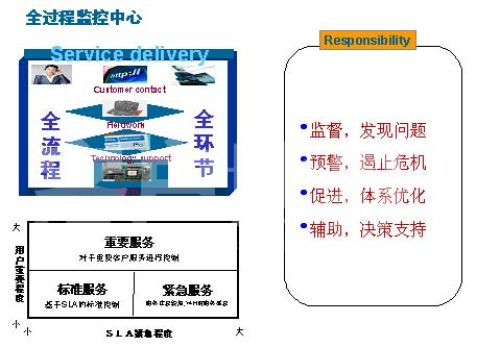 這個(gè)是說我們?cè)谶\(yùn)營體系中如何保證客戶在客戶聯(lián)絡(luò)中心在和網(wǎng)絡(luò)上能夠得到一個(gè)快速地解決他的問題,再一點(diǎn),我的主題其實(shí)是說如何去凸顯客戶聯(lián)絡(luò)中心在企業(yè)中的價(jià)值了,我剛才說到,在客戶聯(lián)絡(luò)中心有一個(gè)非常非常大的寶藏,我覺得真的是一個(gè)無窮的寶藏,就是說你的客戶信息。但是有很多很多企業(yè),攥著這個(gè)信息之后,大家都知道是寶,但不知道如何去用。我認(rèn)為到現(xiàn)在為止也沒有把它挖掘得特別徹底,但把自己的體會(huì)跟大家共享一下,一部分怎么去做這個(gè)監(jiān)控的問題,第一點(diǎn)會(huì)做一個(gè)全過程監(jiān)控中心,也就是在我們聯(lián)絡(luò)中心底下有一支團(tuán)隊(duì)是專門做全過程監(jiān)控中心,它會(huì)把所有職能的關(guān)鍵業(yè)務(wù)點(diǎn),不僅僅是客戶聯(lián)絡(luò)中心,包括跟客戶服務(wù)相關(guān)的所有業(yè)務(wù)環(huán)節(jié)點(diǎn),就用一個(gè)系統(tǒng)體現(xiàn)出來,那么系統(tǒng)體現(xiàn)出來,如果說這個(gè)指標(biāo)是正常的,它就是綠的,這個(gè)指標(biāo)是異常的,在目標(biāo)范圍內(nèi)異常就是紅色的,紅色完了之后,馬上就會(huì)追單,他會(huì)來看這個(gè)客戶級(jí)別是什么級(jí)別,如果這個(gè)客戶級(jí)別是一般性的級(jí)別,可能會(huì)關(guān)注一下這個(gè)指標(biāo)的變化,如果這個(gè)客戶我們叫關(guān)鍵型的客戶,它就會(huì)充當(dāng)起一個(gè)角色來,調(diào)度,他就會(huì)拿起電話來,給相應(yīng)的維修站打電話,這個(gè)單子怎么回事,這個(gè)單子我們說的是兩個(gè)小時(shí),為什么兩個(gè)小時(shí)零5分沒有響應(yīng)?到底出了什么事,你是哪兒資源不夠了,需不需要我?guī)兔?等等一系列的舉措就會(huì)起來。所以能夠保證我們對(duì)不同客戶承諾的要求,能夠得以快速地承諾和兌現(xiàn)。那么在這里面,在整個(gè)監(jiān)控中,其實(shí)是分成不同級(jí)別的,一定是不同的客戶,因?yàn)槲覀冇袃尚r(shí)響應(yīng)和四小時(shí)響應(yīng),有當(dāng)天響應(yīng)的,那一定是說在這里面是一個(gè)完善的信息系統(tǒng)才能去支持?最初做這個(gè)業(yè)務(wù)的時(shí)候,其實(shí)挑戰(zhàn)蠻大,首先這個(gè)團(tuán)隊(duì)就是挑刺的團(tuán)隊(duì),天天發(fā)通報(bào),誰有沒有完成,有沒有怎么樣。但當(dāng)所有的業(yè)務(wù)流程好到比較順的環(huán)節(jié),大家會(huì)覺得這個(gè)團(tuán)隊(duì)其實(shí)是能夠幫助我們?nèi)ヮA(yù)警問題,幫我們解決問題,這個(gè)其實(shí)是幫我們交付質(zhì)量得以提高。