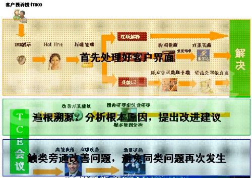 另外一點(diǎn),我們會(huì)做一個(gè)叫做TCE客戶體驗(yàn)會(huì),這個(gè)會(huì)是比較痛苦的一個(gè)會(huì),定期一個(gè)月的時(shí)候,我們會(huì)把典型的CASE拿出來,然后往桌子上一放,全流程就會(huì)解析,這個(gè)CASE從呼叫中心接到電話開始,做了一些什么,到哪個(gè)環(huán)節(jié)解決滯延了,怎么怎么樣,它會(huì)拋這個(gè)CASE,所有的責(zé)任部門就都坐在那兒,然后就看著,看著就要解釋,不是聽完了就完事,到這個(gè)環(huán)節(jié)中只要超過承諾了,那這個(gè)老板就要站起來說這個(gè)問題是怎么怎么回事,我現(xiàn)在在做什么,我承諾在什么時(shí)候完成什么結(jié)果。做TCE會(huì)議的時(shí)候,我的大老板一定是坐在旁邊的,如果說誰稍微滯延什么的,就要被拍磚的,所以在這個(gè)時(shí)候是一個(gè)解析的過程,當(dāng)然在整個(gè)TCE會(huì)議的時(shí)候,我們是希望通過CASE的分解,把所有的人能夠提到一個(gè)層面上來重視這個(gè)問題。