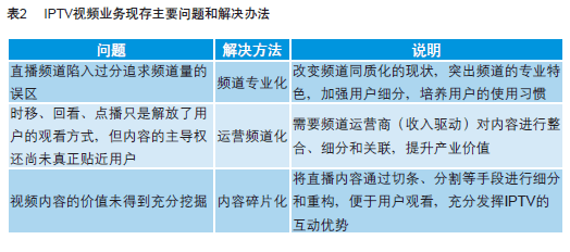 IPTV發(fā)展中,傳統(tǒng)視頻業(yè)務(wù)既是切入點(diǎn),也是業(yè)務(wù)收入的重要來源。但目前視頻業(yè)務(wù)的價值還未得到充分體現(xiàn),互動性優(yōu)勢還未得到充分挖掘。主要問題和解決辦法如表2所示。