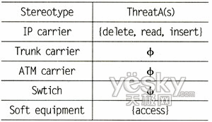 針對圖1中定義的定型以及對網(wǎng)絡安全構(gòu)成威脅的攻擊者的類型,可以定義出威脅函數(shù)TheatA(s)。其中A表示攻擊者類型,這里假定攻擊者為具備一般能力的外部攻擊者,即其可以竊聽到廣播信道上的數(shù)據(jù)流量,并可以插入或刪除數(shù)據(jù)流量,能夠利用系統(tǒng)漏洞入侵系統(tǒng);表示為模型中定義的定型威脅函數(shù)的值域為{delete,read,insert,access}。根據(jù)NGN中承載網(wǎng)絡和計算節(jié)點的特性,我們可以得出如下威脅函數(shù),如表1所示。