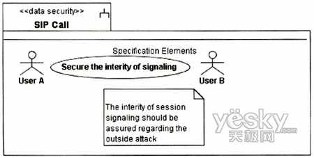圖3中的UA代表UserA或UserB的UA,因為兩個UA的信令交互需要通過Proxy,且其安全需求是一致的,故在圖中只表現(xiàn)出一方。UA和Proxy均是基于通用計算平臺的節(jié)點,其訪問控制需要受到保護,故對其標記上定型《guardedaccess》。UA中除處理信令外,還需處理媒體流的編解碼與控制,這個用例中只涉及信令的安全性,故在UA中只關(guān)注進行信令控制的組件。UA與Proxy之間的通信基于IP承載,根據(jù)表1定義的威脅函數(shù):ThreatA(IP