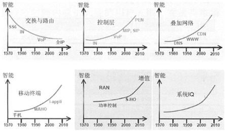 圖2描述了系統(tǒng)構(gòu)件的智能演進(jìn)情況。過去10年中,核心網(wǎng)中交換和路由功能實(shí)體的智能化程度在降低,20世紀(jì)70年代通用信道信令(CCS)的引入,智能網(wǎng)(IN)體系結(jié)構(gòu)的出現(xiàn)更是加劇了這種趨勢(shì)。在智能網(wǎng)體系結(jié)構(gòu)中,電信交換機(jī)的業(yè)務(wù)邏輯被去除,并將其移到分布式數(shù)據(jù)庫中。