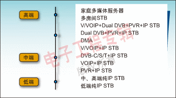 標(biāo)清(SD)對(duì)于大眾市場(chǎng)來(lái)說(shuō)是一個(gè)合乎邏輯的選擇。ODM廠商不管選用哪種操作系統(tǒng)(Windows CE或Linux)都能與NXP公司的IP-STB平臺(tái)相結(jié)合,為本地市場(chǎng)生產(chǎn)所期望的產(chǎn)品。