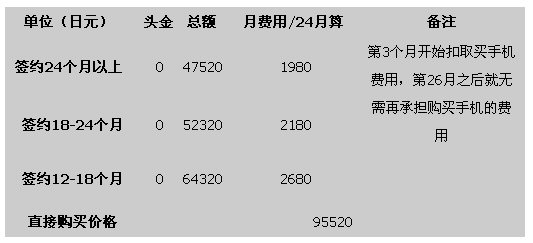 我們都知道日本的購買手機(jī)最主要是和運(yùn)營(yíng)商簽約購買,我們以夏普2009年夏季最新款手機(jī)Soft Bank 933SH為例,來說明一下在日本購買手機(jī)的成本。總的來說,就是簽約時(shí)間越長(zhǎng),購買手機(jī)價(jià)格越低,簽約時(shí)間越短,購買價(jià)格越高。