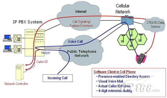 Sprint-Nextel最近推出了一種運(yùn)用Femtocells技術(shù)、類似cFMC的解決方案,稱為Airave。按照這個(gè)方案,用戶把蜂窩通信網(wǎng)絡(luò)的一個(gè)小型基站同基地的寬帶互聯(lián)網(wǎng)連接在一起。如圖1所示,這兩種方案都是利用寬帶互聯(lián)網(wǎng)和蜂窩通信網(wǎng)絡(luò)其中之一實(shí)現(xiàn)Voip,不同的區(qū)別只是本地的無(wú)線連接是運(yùn)用Wi-Fi技術(shù)還是蜂窩通信網(wǎng)絡(luò)。對(duì)企業(yè)用戶而言,主要缺點(diǎn)是,這兩種實(shí)現(xiàn)方式提供的都是由用戶主導(dǎo)的單一語(yǔ)音服務(wù),而沒(méi)有面向企業(yè)PBX或移動(dòng)UC系統(tǒng)的接口。