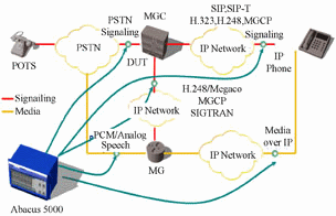 例如,運(yùn)營商在部署VoIP網(wǎng)絡(luò)時(shí),有可能會(huì)采用A廠家的軟交換和B廠家的接入網(wǎng)關(guān)設(shè)備,如何確認(rèn)這兩家的設(shè)備在一起互通時(shí)沒有性能上的問題?這時(shí)可以采用儀表仿真接入網(wǎng)關(guān)下面的模擬線終端,往網(wǎng)關(guān)和軟交換側(cè)發(fā)起呼叫,再由軟交換將呼叫路由回網(wǎng)關(guān)再到終端。通過這種方式,由儀表發(fā)起成千上萬的呼叫經(jīng)過接入網(wǎng)關(guān)和軟交換,可以有效地驗(yàn)證這兩種設(shè)備在互通的時(shí)候有沒有性能和穩(wěn)定性問題。