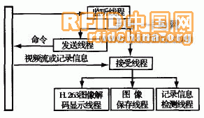 在軟件設(shè)計方面包括兩部分,一部分是監(jiān)控終端的監(jiān)控軟件,另一部分是各便件的底層軟件。監(jiān)控終端采用了多線程的軟件設(shè)計方法,系統(tǒng)對連接的每一個監(jiān)控點共采用了6個線程,即網(wǎng)絡(luò)監(jiān)聽線程、發(fā)送線程、接受線程、H.26 3圖像解碼顯示線程、圖像保存線程和記錄信息(門口終端的撥號、門禁一卡通等記錄信息)檢測線程,如圖4所示。