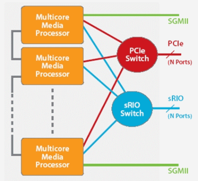 圖3說(shuō)明,高速串行I/O在復(fù)雜視頻處理任務(wù)中的潛在應(yīng)用。圖中顯示用于擴(kuò)展多個(gè)器件中多核器件處理能力的連接方案,其可以實(shí)現(xiàn)更復(fù)雜的視頻處理運(yùn)算或支持更多視頻轉(zhuǎn)碼通道。采用sRIO開(kāi)關(guān)能夠?qū)崿F(xiàn)更靈活的器件間通信,不過(guò)如果處理流處于相鄰器件之間,也可以不采用這種開(kāi)關(guān)。與PCIe開(kāi)關(guān)相比,sRIO由于其數(shù)據(jù)包開(kāi)銷(xiāo)較低,因此一般成本更低、性能更高、且時(shí)延更短。