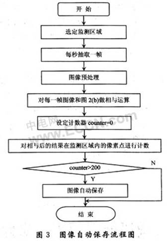 對(duì)每一幀都做上述處理,經(jīng)過一段時(shí)間的監(jiān)測后,系統(tǒng)會(huì)自動(dòng)保存一些危險(xiǎn)情況存在時(shí)的圖像(灰度圖形式)。圖像自動(dòng)保存方法流程圖如圖3所示。