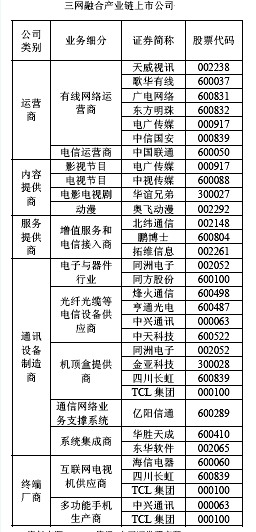 機頂盒產(chǎn)業(yè)也將受益。方正證券稱,中國電信(行情,資訊,評論)在多個城市開展IPT V業(yè)務(wù)試點首先需要對IPT V機頂盒進行采購,而廣電運營商從標(biāo)清單到高清再到互動雙向的網(wǎng)絡(luò)升級改造也帶來了大量的機頂盒新增需求和更新?lián)Q代需求。同時,“三網(wǎng)融合”重點工作也提出,“要支持三網(wǎng)融合共性技術(shù)、關(guān)鍵技術(shù)、基礎(chǔ)技術(shù)和關(guān)鍵軟硬件的研發(fā)和產(chǎn)業(yè)化。將“三網(wǎng)融合”相關(guān)產(chǎn)品和業(yè)務(wù)納入政府采購范圍。隨著有線網(wǎng)絡(luò)運營商向電信級運營商轉(zhuǎn)型,低端的設(shè)備制造商亦會進行產(chǎn)品和服務(wù)升級以依托產(chǎn)業(yè)鏈獲得長久生命力。   軟件提供商同樣將分享蛋糕。方正證券表示,三網(wǎng)融合重點工作要求選擇有條件的地區(qū)開展雙向進入試點、加強網(wǎng)絡(luò)建設(shè)改造、強化網(wǎng)絡(luò)管理。數(shù)據(jù)、增值業(yè)務(wù)、節(jié)目等內(nèi)容的發(fā)展會帶來數(shù)據(jù)和交換中心的更新?lián)Q代和升級,也將帶來網(wǎng)絡(luò)安全建設(shè)的加強,從而給計算機硬件及軟件,特別是軟件中的系統(tǒng)集成業(yè)務(wù)帶來發(fā)展。