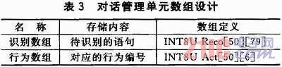 為了方便進(jìn)行對話的管理,本文中設(shè)計(jì)了一個(gè)對話管理單元,用于對等待識別的語句和等待執(zhí)行的命令進(jìn)行存儲(chǔ),在主控制器中通過定義二維數(shù)組來實(shí)現(xiàn)。LD3320每次識別最多可以設(shè)置50項(xiàng)候選識別句,每個(gè)識別句可以是單字、詞組或短句,長度為不超過10個(gè)漢字或者79個(gè)字節(jié)的拼音串;谏鲜鲈,本文設(shè)計(jì)的對話管理數(shù)組如表3所列。