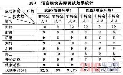 測試中的3個(gè)非特定人中,非特定人1為女性,非特定人2和非特定人3為男性。由表中數(shù)據(jù)可以看出,家庭環(huán)境下對非特定人的語音識別率可達(dá)到90%以上,嘈雜的醫(yī)院環(huán)境下的語音識別率也可達(dá)82.5%以上。識別率方面,在嘈雜環(huán)境下比在安靜環(huán)境下的語音識別率有所降低;穩(wěn)定性方面,在安靜環(huán)境下系統(tǒng)的穩(wěn)定性較好,語音說1遍,最多說2遍模塊就可以做出正確的響應(yīng);在噪聲環(huán)境下,系統(tǒng)的穩(wěn)定性有所下降,個(gè)別語音命令需要說3遍甚至3遍以上才能被模塊準(zhǔn)確識別;實(shí)時(shí)性方面,在安靜環(huán)境下的語音能保證系統(tǒng)響應(yīng)的實(shí)時(shí)性,響應(yīng)時(shí)間一般不超過1 s,在噪聲環(huán)境下的響應(yīng)時(shí)間相對長一些。