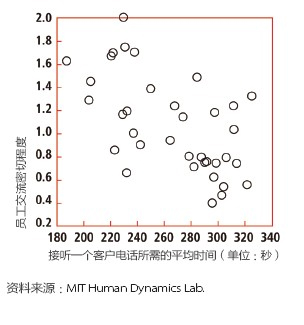 去年,彭特蘭的實驗室與美國銀行(Bank of America)設在羅得島(Rhode Island)的呼叫中心合作,在80 名中心員工身上安裝了社會傳感器。這種傳感器看起來像一枚不顯眼的徽章,使用藍牙和紅外信號監(jiān)測實驗對象每分鐘與哪些同事交談。測試活動先開展了一個月,后來又進行了6周。第一個月后,實驗室的研究人員發(fā)現(xiàn),與更多同事進行過交談的員工能夠更快地接通電話,他們自我感覺的壓力也相對較小,而客戶滿意度卻與其他人一樣高。與刻板地遵循員工手冊或服從經(jīng)理的電子郵件指示相比,通過非正式的閑聊來交流問題和解決方案似乎能取得更好的結(jié)果。有了這種結(jié)論之后,該呼叫中心嘗試盡量將員工的休息時間安排在一起,而非像過去那樣錯開。這樣員工就有了更多的時間參與閑聊。幾個月后,美國銀行向?qū)嶒炇覉蟾媪私Y(jié)果:該呼叫中心獲得了相當于每年1,500 萬美元的生產(chǎn)力提升。