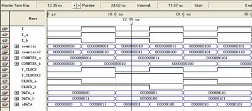 使用的信號包括:數據信號data_a,dat_b;讀寫有效信號wren_a,wren_b;地址信號address_a,address_b;時鐘信號clock_a,clock_b;輸出數據信號q_a,q_b?梢钥吹剿械男盘柖际浅蓪Τ霈F的,就是為了進行乒乓方式的數據傳輸。分成了兩個RAM區(qū)域,A和B,相當于前面講乒乓方式里的數據緩沖模塊1和2。兩個RAM塊是交替著讀寫(由I_a和I_b決定),輸出數據流也是由I決定。剛說到寫時鐘是13.5M,讀時鐘是27M,所以clock_a和clock_b必須是讀寫時鐘切換著輸入,而且地址的計數也不一樣,寫周期時候地址增加的時鐘是13.5M,讀周期地址增加的時鐘是27M。所以每行的數據讀了兩遍,相當于隔行變逐行。圖6在Qartus II下RAM的乒乓操作功能仿真圖: