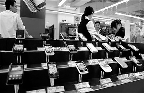 消費者在剛剛開業(yè)的福州樂購家電區(qū)選購手機,智能手機系統(tǒng)和軟件的發(fā)展,正在成為移動互聯(lián)網(wǎng)發(fā)展的“助推器”