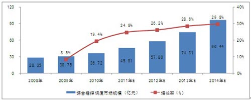 受市場(chǎng)的推動(dòng),未來幾年我國(guó)綜合指揮調(diào)度系統(tǒng)建設(shè)的范圍將逐步擴(kuò)大。2011到2014年,我國(guó)綜合指揮調(diào)度市場(chǎng)的復(fù)合增長(zhǎng)率將達(dá)到28.16%,2014年市場(chǎng)規(guī)模將達(dá)到96.44億元。